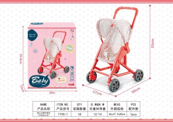 Kolorowy wózek spacerowy dla lalek, to zabawka dla dzieci od trzeciego roku życia. Wózek wykonano z bezpiecznych dla dziecka materiałów w żywych kolorach. Wózek jest stabilny i łatwy do przemieszczania.