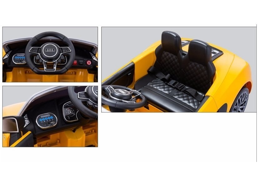 Prezentowany roadster Audi R8 pod swą sportową maską ukrywa szereg udogodnień, podnoszących bezpieczeństwo i komfort każdego dziecka. Wewnątrz pojazdu znajduje się miękka, dwuosobowa kanapa połączona z pasem biodrowym. Wykonano ją z czarnej skóry ekologicznej ozdobionej stylizowanym pikowaniem. Tuż obok umieszczono kierownicę wyposażoną w klakson, a także podświetlaną na niebiesko deskę rozdzielczą, imitującą zegary i wskaźniki — dokładnie tak, jak w aucie dla dorosłych. Na koniec zostawiliśmy coś, co sprawi, że każda podróż żółtym modelem Audi R8 Spyder będzie fantastycznym doświadczeniem — wewnątrz autka znajduje się radio FM, które bez najmniejszych trudności można połączyć z odtwarzaczem MP3 lub pamięcią USB.