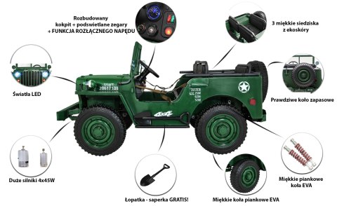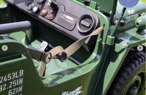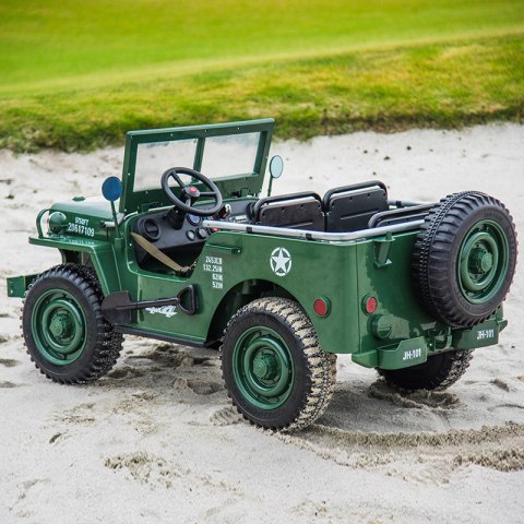 Pierwszy taki samochodzik na akumulator w wojskowym stylu retro! JEEP WILLYS rodem z IIWŚ. Wyposażony w aż 3 siedziska dla dzieci o maksymalnym łącznym obciążeniu 60kg.