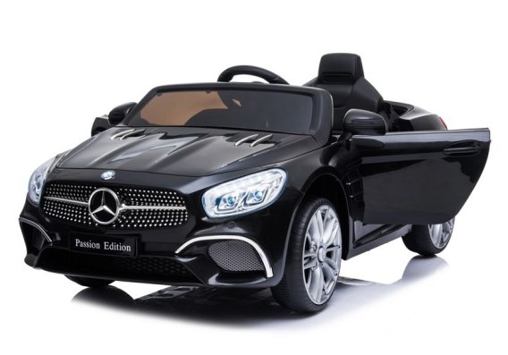 Czarne auto odznacza się wieloma zaletami — przede wszystkim kolorystyką, która z pewnością skradnie serce każdego malucha, a także budową inspirowaną wersją Mercedesa SL400 dla dorosłych kierowców. Charakterystycznymi elementami omawianego pojazdu jest nowoczesna konstrukcja o opływowym kształcie, z zaznaczonymi muskularnymi przetłoczeniami przebiegającymi przez maskę, co nadaje pojazdowi sportowego charakteru. Dziecięcy kabriolet to wysoce estetyczny model — dużą zaletą jego konstrukcji jest grill z połyskującym wypełnieniem oraz logo marki Mercedes, stanowiącym rewelacyjne dopełnienie. Warto również zwrócić uwagę na przedni spoiler, smukłe reflektory LED, podnoszące poziom bezpieczeństwa i widoczności, a także typowe dla modeli SL skrzela, stanowiące innowacyjną ozdobę.