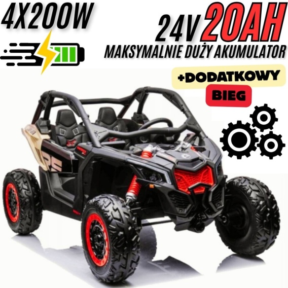 ORYGINALNY CAN-AM MAVERICK w wersji 24V z czterema silnikami po 200W każdy!!Łącznie aż 800W mocy! Akumulator o łącznej pojemności 24V20Ah - NAWET ponad 3h jazdy na jednym naładowaniu!