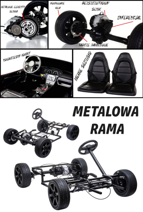 światła przednie i tylne LED, panel muzyczny, pilot do sterowania, podświetlane zegary, otwierane drzwi, skórzane siedzenia