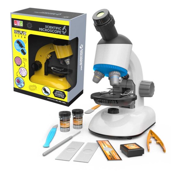 Mikroskop dla małego naukowca od 6-go roku życia. Mikroskop wykonany został z najlepszej jakości materiałów, umożliwia obserwację obiektów nawet w powiększeniu 1200 razy. W zestawie z mikroskopem znajdują się również akcesoria takie jak próbówki, gotowy preparat, 2 szkiełka do preparatu, pudełko na mikroorganizmy czy pęseta. Mikroskop zasilany jest bateriami typu 2 x AA 1,5 V (brak w zestawie).