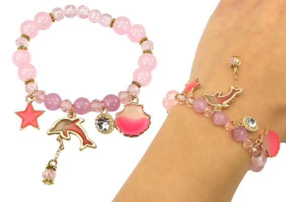 Jej urok tkwi w delikatnych różowych koralikach, które przeplatają się z złotymi elementami, dodając blasku i elegancji. Dodatkowo, zawieszki w kształcie muszelki delfinka i gwiazdki nadają bransoletce niepowtarzalnego wyglądu, inspirując do marzeń o podwodnym świecie i niezwykłych przygodach.