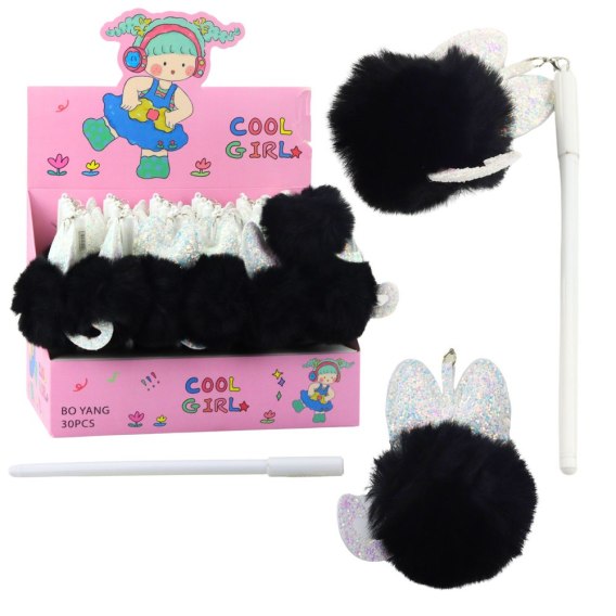 Długopis żelowy z pomponem - czarny z uszkami