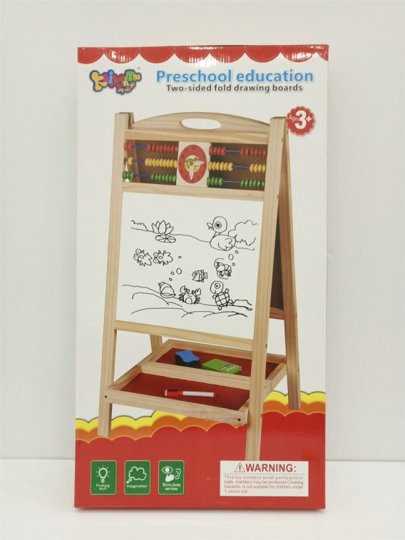Duża drewniana tablica, to zabawka edukacyjna dla dzieci od 3 - go roku życia. Tablica jest z jednej strony biała magnetyczna, a z drugiej kredowa. Biała strona służy do pisania pisakiem znajdującym się w zestawie. Pisak posiada magnez, żeby go można było przyczepić do tablicy oraz gumkę do mazania. W górnej części tablicy znajduje się liczydło i zegar z przesuwanymi wskazówkami. Na kredowej stronie można malować kredą znajdującą się w zestawie, a potem wymazać wszystko gąbką. Zabawa z tablicą pozytywnie wpływa na zdolności manualne, koncentrację i wyobraźnię. Tablica nie wymaga montażu, wystarczy ją wyjąć z opakowania i rozsunąć dolne półeczki.