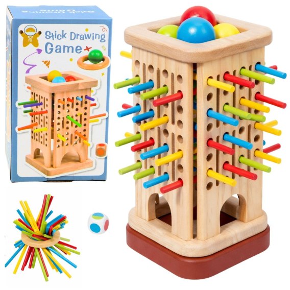 Drewniana Gra Zręcznościowa Edukacyjna Wieża Patyczki Kulki Kostka 37 el.