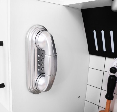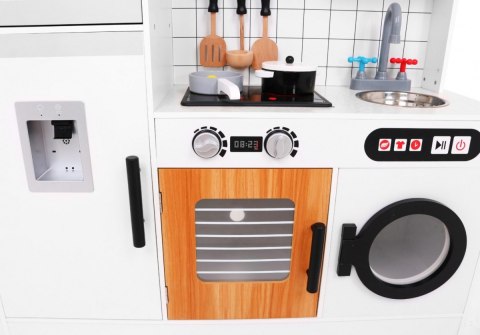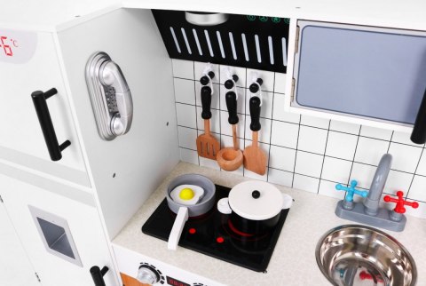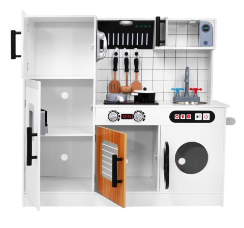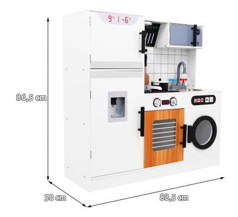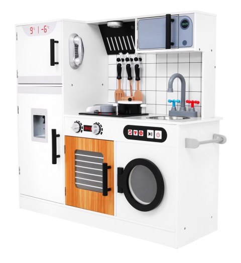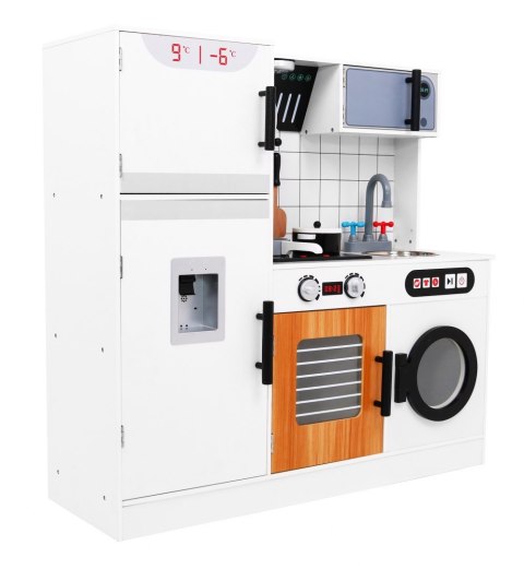 Prezentowany przez nas zestaw kuchenny składa się z wielu elementów takich jak lodówka z zamrażarką i dystrybutorem wody, kuchenki mikrofalowej, pralki, piekarnika, kranu, zlewu, okapu, atrapy telefonu, patelni z jajkiem smażonym, garnka z pokrywką, chochelki, 2 łopatek. Każde z drzwiczek posiada zawias i magnes co uniemożliwia samoczynne otwieranie się drzwi.  W opakowaniu znajduje się instrukcja montażu kuchni. Zestaw zasilany jest bateriami typu AAA (3 x 1,5 V) - światełka LED nad okapem, AAA (2 x 1,5V) - dystrybutor wody, AAA (2 x 1,5V) - blaty grzewcze. Wszystkie baterie w zestawie.