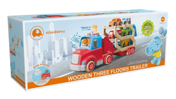 Drewniana, interaktywna laweta z pojazdami w zestawie dla dzieci od osiemnastego miesiąca życia. Zabawka wykonana została z najlepszej jakości materiałów: plastiku i drewna. Żywe kolory przyciągają uwagę dziecka i zachęcają do zabawy. Lawetę można odpiąć od pojazdu lub rozłożyć i stworzyć tor dla autek. W zestawie znajduje się 6 drewnianych pojazdów: policja, taksówka, wóz strażacki, karetka, autobus, samochód dostawczy. Na dachu pojazdu jest przycisk odpowiedzialny za generowanie odgłosów odpalania ciężarówki, trąbienia czy odtwarzania melodii. Efektom dźwiękowym towarzyszy mruganie światełek. Z przodu ciężarówki znajduje się zaczep na ewentualny sznureczek do ciągnięcia zabawki.Zabawka zasilana jest bateriami typu 3 x AG13 (baterie w zestawie).