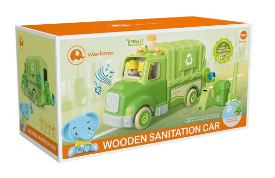 Interaktywna śmieciarka z funkcją dźwięku i światła dla dzieci od osiemnastego miesiąca życia. Zabawka wykonana została z najlepszej jakości materiałów: drewna i plastiku. Nie posiada ostrych krawędzi. Śmieciarka posiada działający podnośnik kosza na śmieci (korbka) i funkcję wysypywania. Na dachu śmieciarki znajduje się przycisk uruchamiający melodie i efekty świetlne w postaci mrugających światełek. W zestawie znaleźć możemy 2 figurki, kosz na śmieci, zmiotkę i znak ostrzegawczy. Zabawka zasilana jest bateriami typu 3 x AG13 (w zestawie).