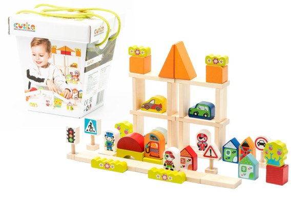 Przedstawiamy drewniany zestaw dla chłopca, dzięki któremu dziecko samodzielnie zbuduje własne miasto z drogą i parkiem. Trochę wielobarwnych drewnianych detali, a także fantazja i miasto gotowe! Zestaw składa się z 55 różnych tematycznie elementów z wizerunkami samochodów, roślin, domków itd.