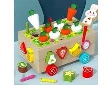 Sorter ma kształt skrzynki, na górnej ściance znajdziesz małe pole marchewek. Zbieraj małe marchewki i sprawdź na jaką trafisz- białą niedojrzała czy pomarańczową, na bocznych ścianach znajdują się otwory w kształtach owoców. Twoje dziecko będzie mogło ćwiczyć umiejętność dopasowywania odpowiednich kształtów oraz poznać nazwy warzyw i owoców.