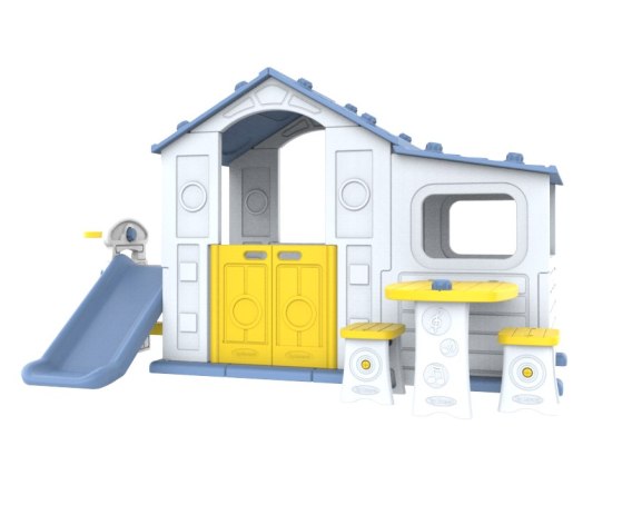 Domek ogrodowy ze zjeżdżalnią, koszykówką oraz ze stolikiem