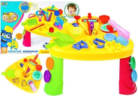 Stolik zawiera mnóstwo akcesoriów do zabawy w tworzenie i modelowanie z ciastoliny.