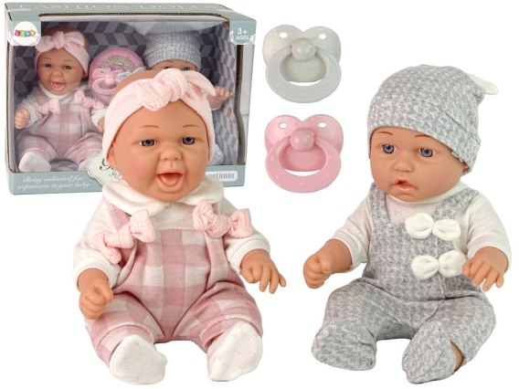Lalki ubrane są w eleganckie, przyjemne w dotyku ubranko. Na głowie bobasa znajduje się słodka czapeczka, a na nóżkach skarpetki. Jedna lalka ma ubiór w szarym kolorze nawiązującym do chłopczyka, natomiast druga różowy strój w kratkę, charakterystyczny dla dziewczynki. Dwie lalki jako siostra i braciszek.  Całość idealnie pasuje do siebie i wygląda wprost uroczo.