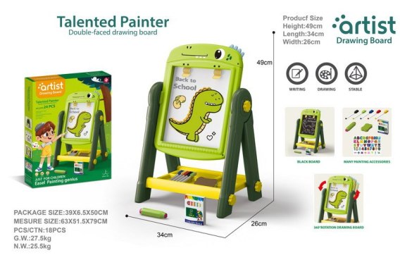 Dwustronna tablica na stojaku z akcesoriami dla dzieci od 3-go roku życia. Konstrukcja stojaka jest stabilna i łatwa w montażu. Tablice z obydwóch stron są magnetyczne, można przyczepiać do nich magnesy z zestawu. Po czarnej stronie rysuje się kredą, a po białej flamastrami. W zestawie znajduje się uchwyt na kredę, kreda, flamastry i magnesy z literkami, cyferkami i działaniami matematycznymi. Pod tablicą umiejscowiono praktyczną półeczkę na akcesoria dostępne w zestawie. Po białej stronie, w górze przyczepione są dwa klipsy, do których przymocować możemy kartkę papieru. Zestaw rozwija zdolności manualne, ćwiczy rękę.
