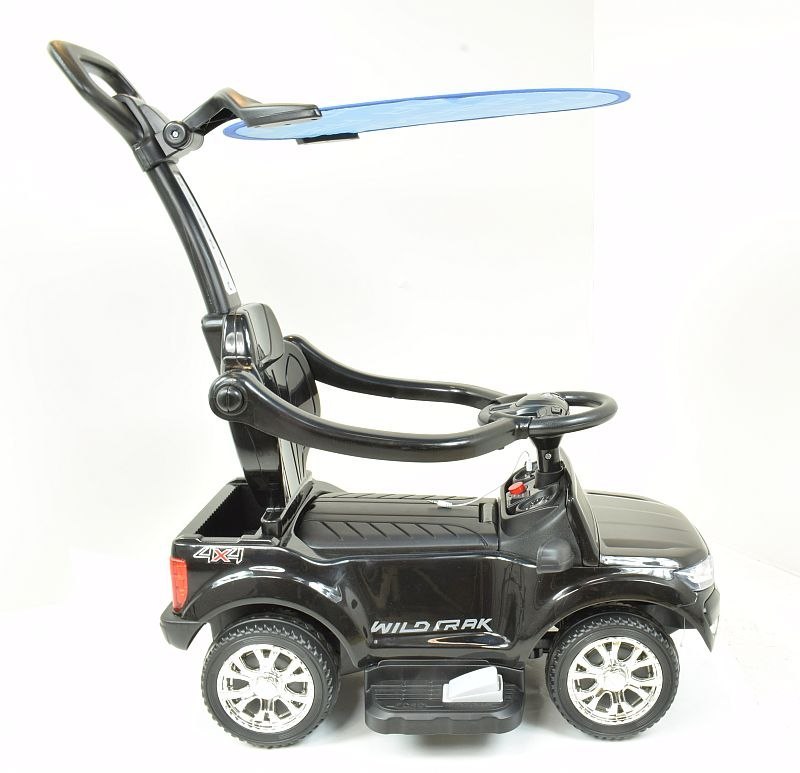 Dźwięki klaksonu, melodie , dźwięk uruchamiana silnika orazrączka do pchania, barierki zabezpieczające, wymienne oparcie, składany i zdejmowany daszek, jest również pojazdem napędzanym silnikiem