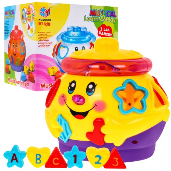 Interaktywna zabawka dla dzieci od trzeciego roku życia. Zestaw składa się z interaktywnego garnuszka oraz sześciu wielobarwnych klocków, których kształty można dopasować do otworów w ściankach garnuszka. Zabawka po włączaniu jeździ, śpiewa , odbija się od przeszkód. Całej zabawie towarzyszy miganie kolorowych światełek i podkład muzyczny. Praktyczny schowek wewnątrz garnuszka to miejsce gdzie przechowywane są klocki z zestawu i skarby malucha. Zabawka zasilana jest 3 bateriami typu AA (brak w zestawie). Funkcje zabawki: - świetlne (migające światełka), - dźwiękowe (muzyka), - poznawcze-kształcące (sorter), - zabawka porusza się w każdym kierunku, odbija się od przeszkód.
