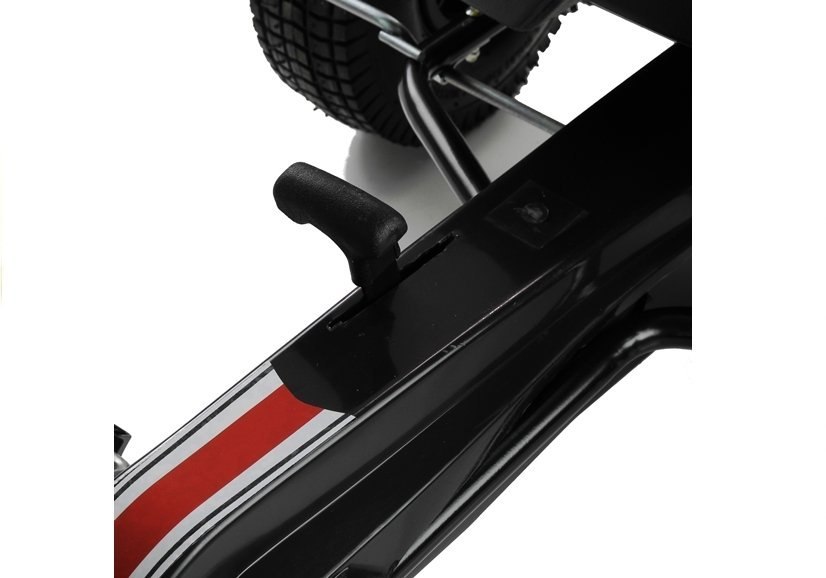 Ulokowanie białego gokarta na pompowanych kołach sprawia, że kierowca może jeździć swym dwuśladem po różnych nawierzchniach. Za komfort jazdy odpowiada także czarny, szeroki fotel z opieraniem, którego odległość od pedałów można regulować, a także wygodna kierownica o ergonomicznym kształcie. Udogodnienia te w połączeniu z szerokimi na 8 cm kołami sprawiają, że prezentowany gokart sprosta wszystkim warunkom — sprawdźcie to sami!