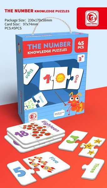 Gra edukacyjna, matematyczna Liczby, Angielski dla dzieci od 3-go roku życia. Gra składa się z 45 puzzli, dzięki którym dziecko uczy się cyferek w języku angielskim i dopasowywać kształty. Gra trenuje również koordynację ręka-oko, rozwija spostrzegawczość i koncentrację. Z puzzli, możemy ułożyć 15 plansz, na której znajduje się cyfra, odpowiadająca jej liczba przedmiotów i słownie cyfra w języku angielskim.