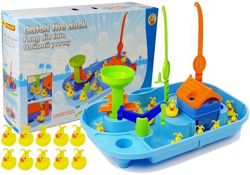 Zestaw to korytko, które należy wypełnić wodą. Tworzy się tzw. tor wodny, a w jego środku znajdują się korytarze wodne, po których pływają kaczuszki. Każdy z graczy (maksymalnie dwóch) posiada wędkę z haczykiem, na którą musi złowić niesforne pisklaki. Komu uda się ich najwięcej wyciągnąć z wody, ten wygrywa!