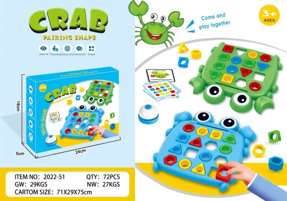Zręcznościowa gra z krabem, dopasuj kolory, dopasuj kształty, ćwicz refleks dla dzieci od trzeciego roku życia. Gra składa się z dwóch plansz o kształcie kraba, kart z zadaniami i wyzwaniami, kart karnych, pionków o różnych kształtach i kolorach oraz dzwoneczka. W grę można grać samodzielnie lub w dwie osoby. Grając samodzielnie, losujemy kartę, kładziemy ją we wgłębieniu znajdującym się na górze planszy. Następnie próbujemy ułożyć pionki na planszy, w taki sposób jak to pokazuje karta. Dziecko uczy się rozpoznawać kształty i kolory. Jeżeli gramy w dwie osoby to wygrywa ta, która jako pierwsza skończy układać wzór z karty i naciśnie na dzwoneczek. Jeżeli wzór został ułożony poprawnie, gracz zabiera kartę, jeżeli zaś źle, wówczas gracz losuje kartę z pytaniami, a jeśli źle odpowie na pytanie wówczas musi podjąć wyzwanie. Jeżeli nie podejmie wyzwania, wówczas czeka na niego karta karna.  Gra uczy przez zabawę spostrzegawczości, kształtów, kolorów, szybkości podejmowania decyzji.