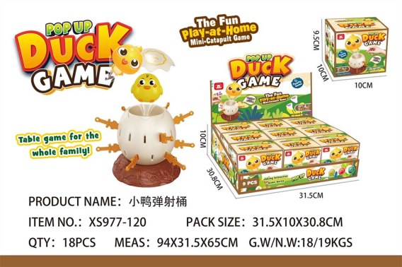 Gra zręcznościowa Skacząca Kaczka dla dzieci od 3-go roku życia. Zabawna gra polega na umiejscowieniu jajka z kaczką w środku na podstawce i naciśnięciu mechanizmu. Następnie każdy z graczy otrzymuje miecze i wkłada je po kolei w otwory na jajku. Należy uważać, żeby nie ugodzić kaczki znajdującej się w jajku. W przeciwnym razie wyskoczy z jajka niczym z procy. Wygrywa osoba, która jako pierwsza włoży w jajko wszystkie swoje miecze lub więcej niż przeciwnik, zanim kaczka wyskoczy.
