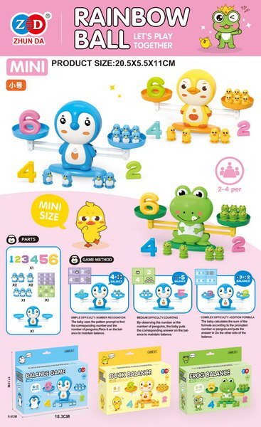 Gra zręcznościowa Waga Balansująca Kaczka dla dzieci od 3-go roku życia. Ta fascynująca gra, zapewni Twojemu dziecku, długie godziny edukacyjnej zabawy. Gra składa się z wagi szalkowej z uroczą kaczką w środku odważników w postaci małych kaczek i cyferek oraz karty z zadaniami matematycznymi. Po jednej stronie wagi układamy cyferki a po drugiej odpowiednią ilość kaczek, tak aby zachować balans. Gra rozwija umiejętności dodawania, logiczne myślenie, wyobraźnie i kreatywność. Dziecko poznaje podstawy matematyki i fizyki.