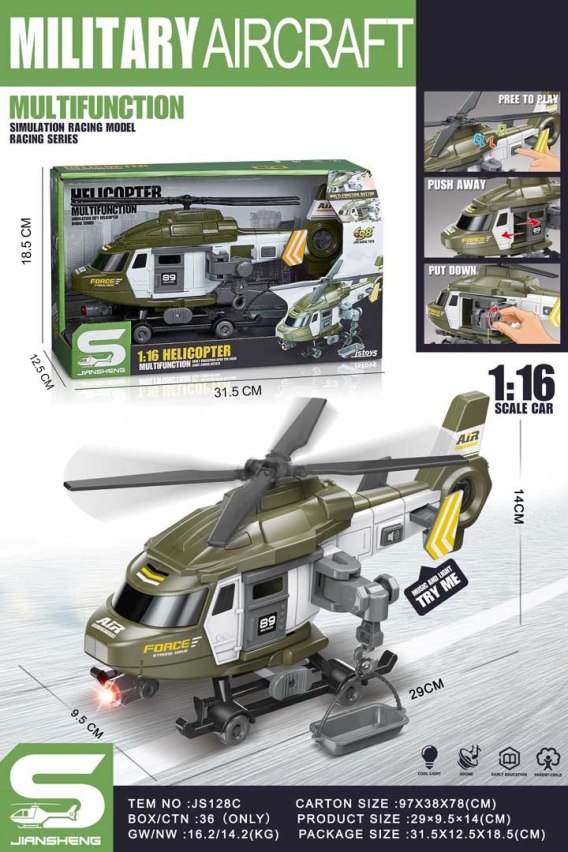 Interaktywny, wojskowy helikopter ratunkowy, wykonany w skali 1:16, dla dzieci od 3-go roku życia. Wykonany został z najlepszej jakości plastiku w żywych kolorach. Helikopter posiada ruchome elementy takie jak otwierane drzwi, ruchomy hak z koszem, kółka i śmigła. Drzwi otwieramy, przesuwając je w lewo lub prawo, natomiast aby podnieść lub opuścić kosz należy kręcić kółkiem. Zabawka posiada efekty świetlne w postaci oświetlenia LED na dole helikoptera oraz efekty dźwiękowe w postaci autentycznych dźwięków wydawanych przez prawdziwy helikopter ratunkowy. Zabawka zasilana jest bateriami typu 3 x AG13 1,5 V(w zestawie).