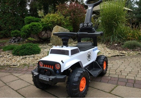 Duży, mocny i wykonany z najlepszej jakości tworzywa jeździk w kolorze białym. Jego nowoczesny styl zadowoli gusta najmłodszychmiłośników czterokołowców. Jeździk wyposażony jest w silnik 1x25W oraz akumulator 6 V, co umożliwia osiągnięcie prędkości od 2 do 4 km/h. Samochód posiadadwa biegi— do przodu i tyłu, a także elektryczny hamulec, działający automatycznie po zdjęciu nogi z pedału gazu.