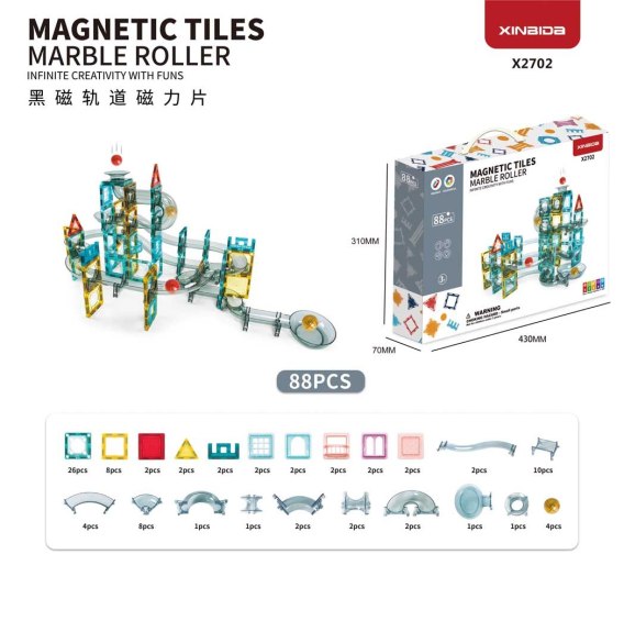Kolorowy, wytrzymały, tor do samodzielnego montażu z kuleczkami dla dzieci od 3 - go roku życia. Zabawa polega na samodzielnym zbudowaniu konstrukcji toru, a potem puszczaniu piłeczek tunelami. Można wzorować się na instrukcji obrazkowej, znajdującej się w zestawie lub stworzyć swoją własną wieżę. Puszczanie w ruch kuleczek i obserwowania jak pokonuje kręte tunele, daje mnóstwo radości, uspokaja i wycisza. Zabawka pozytywnie wpływa na rozwój kreatywności, wyobraźni i zdolności manualnych.