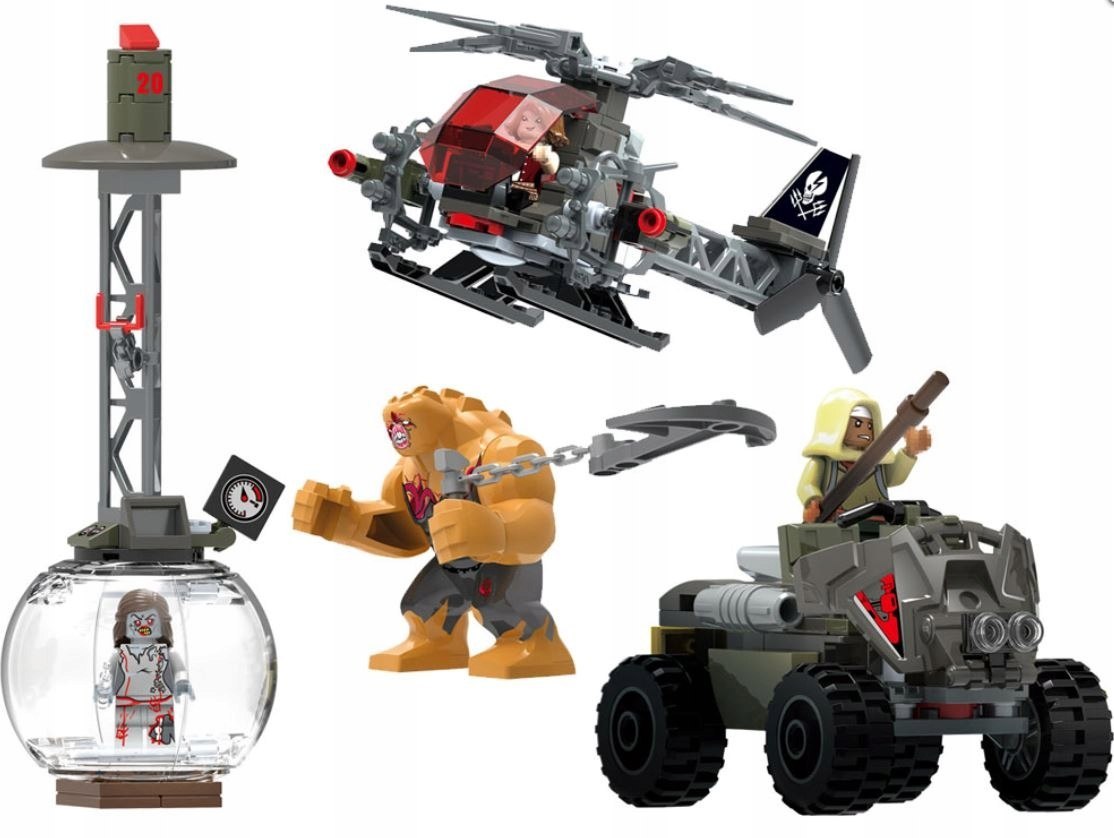 Zestaw klocków technicznych pozwalający na zbudowanie bazy wojskowej specjalizującej się w ściganiu stworów nie z tego świata- zombie i mutantów.