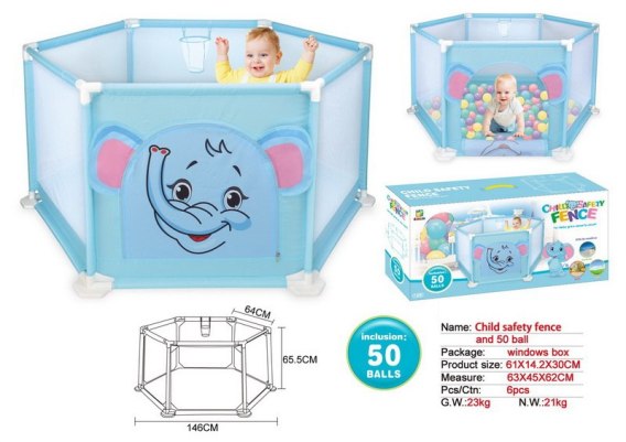 Kojec z koszykówką i piłeczkami w zestawie dla dzieci od 3-go roku życia. Kojec jest lekki, dzięki czemu można go szybko przenieść w wybrane miejsce. Nadaje się do użytku w pomieszczeniu lub na zewnątrz. Materiał, z którego jest wykonany, bardzo łatwo się czyści i dezynfekuje. Kojec posiada 5 ścianek wykonanych z siateczki, dzięki czemu możemy z łatwością obserwować dziecko. Ścianka zwesołym słonikiem posiada zamek błyskawiczny, dzięki czemu malucha można swobodnie wchodzić i wychodzić. Na jednej ze ścianek, wewnątrz umieszczono kosz na piłki, a w zestawie znajduje się 50 piłeczek. Kojec jest w pełni bezpieczny dla malucha i stabilny.