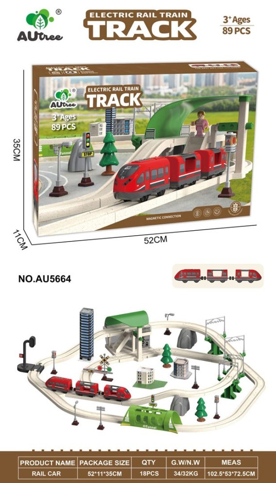 Interaktywna kolejka dla dzieci od trzeciego roku życia. Zestaw wykonano z bezpiecznych i trwałych materiałów, co gwarantuje mu niezawodność i długi okres użytkowania. W zestawie znajdują się tory, po którym porusza się pociąg, budynek stacji, tunel, jest też sygnalizacja świetlna. Na wyposażeniu mamy również budynki miejskie, znaki drogowe oraz figurkę. Ten zestaw daje wiele możliwości kreatywnej zabawy.Tunel zasilany jest bateriami typu 3 x AG13 (w zestawie), przejeżdżający przez niego pociąg uruchamia odgłosy jazdy pociągu i kolorowe mrugające światełka. Stacja kolejowa zasilana jest bateriami typu 3 x AG3 (w zestawie), posiada podświetlenie i wydaje odgłosy jazdy pociągu. Sygnalizacja świetlna zasilana jest bateriami typu 3 x AG3 (w zestawie), posiada efekty świetlne w postaci zmieniających się światełek. Pociąg zasilany jest bateriami typu 2 x AAA 1,5V (brak w zestawie), jeździ do przodu i do tyłu oraz wydaje odgłosy jazdy i ma podświetlane przednie reflektory.