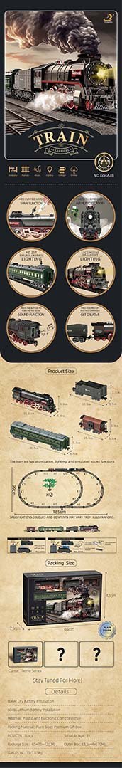 Zestaw retro kolejka z funkcją dymu i odgłosami jazdy, a także torami w zestawie to propozycja dla dzieci od 3-go roku życia. Zabawka zasilana jest akumulatorem typu 3,7 V 1200 mAh (w zestawie). Podczas jazdy lokomotywa wypuszcza z komina i po bokach dym (po wcześniejszym uzupełnieniu jej wodą - pipetka do wody dołączona do zestawu, dodatkowo świeci się światełko zamontowane w części frontowej. Tory posiadają łatwy sposób łączenia, dzięki temu są bezpieczne i wytrzymałe w użytkowaniu.
