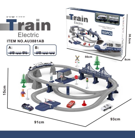 Bogato wyposażony zestaw tory kolejowe, pociąg i akcesoria dla dzieci od 3-go roku życia. Zestaw wykonany został z najlepszej jakości plastiku, jest solidny i wytrzymały. Zawiera aż 103 elementy: elementy konstrukcyjne dwupoziomowego toru, pociąg, stację z efektami dźwiękowymi i świetlnymi, most, szlaban, znaki drogowe, autka i figurkę chłopca. Stacja zasilana jest bateriami typu 3 x AG3 1,5 V (w zestawie), pociąg bateriami typu 2 x AAA 1,5 V (brak w zestawie).