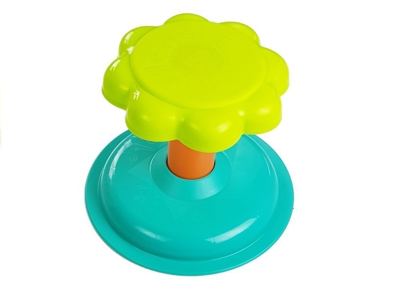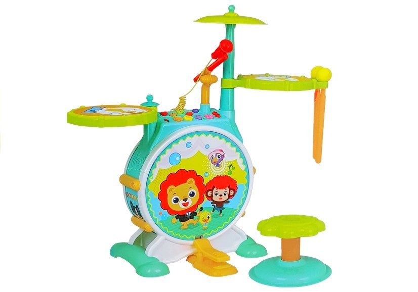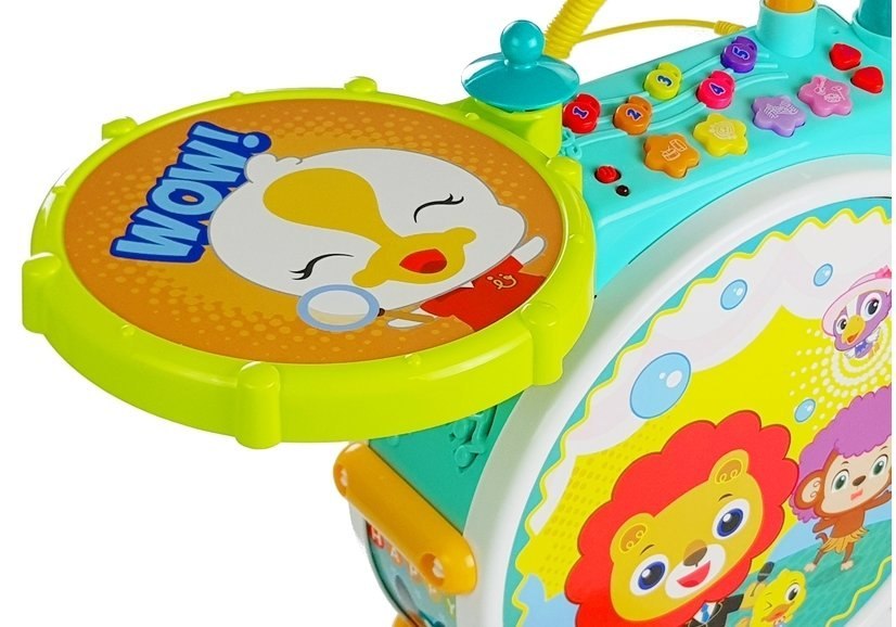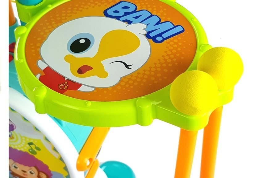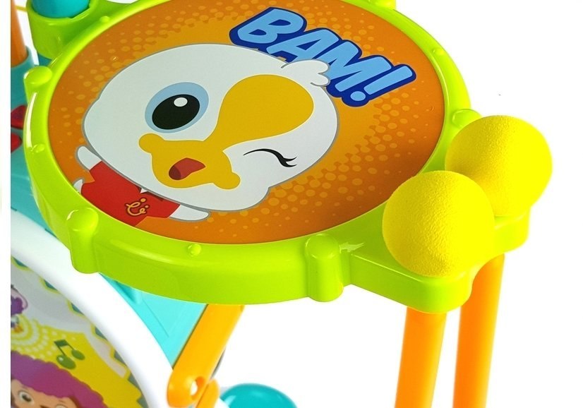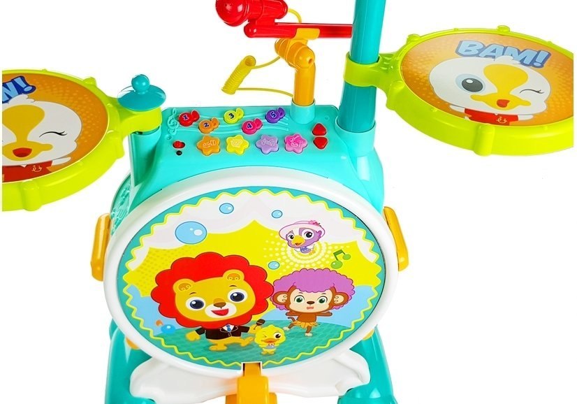 Uderzając pałeczkami w werble (lewy i prawy) i talerz, usłyszysz dźwięki realnych instrumentów. Dźwięk z dużego bębna uaktywniamy pedałem.Dodatkowo zabawę uatrakcyjnia panel muzyczny na którym znajdują się kolorowe przyciski i światełka z podkładami muzycznymi i rytmicznymi.Pod każdą z nutek rozmieszczonych na pięciolinii (1-5) kryją się skoczne i wesołe motywy muzyczne (5 różnych melodii).Niebieska gwiazdka z bębnami - kryje odgłosy bębna.Żółta gwiazdka z nutkami kryje odgłos wybijającej sprężyny.