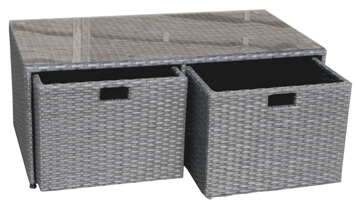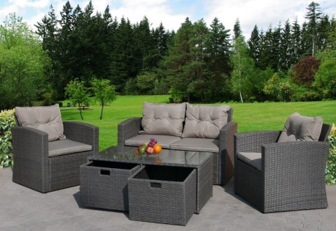 W skład zestawu wchodzą dwa wygodne fotele, komfortowa kanapa, funkcjonalna ława z dwiema szufladami i osiem miękkich poduszek (cztery poduszki na siedziska i cztery poduszki na oparcie ozdobione guzikami). Szuflady stołu można wykorzystywać jako schowek na poduszki.
