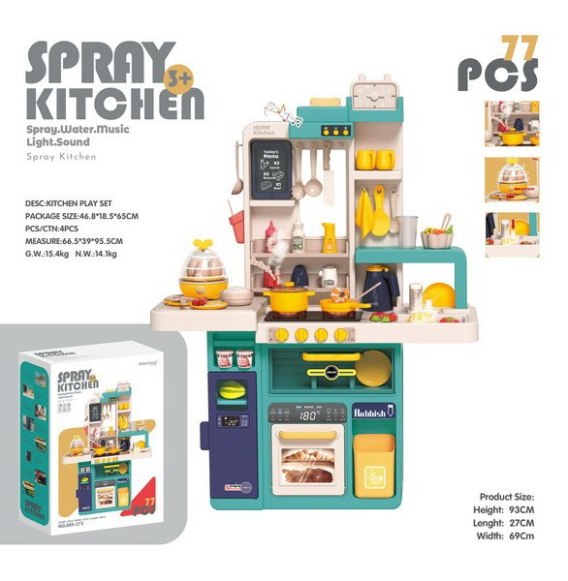 Interaktywna kuchnia z funkcją światła, pary wodnej, dźwięku i kranikiem, z którego wydobywa się woda, a także mnóstwem akcesoriów, dla dzieci od 3-go roku życia. Kuchnia została znakomicie wykonana, z najlepszej jakości plastiku i jest w żywych kolorach zachęcających dziecko do zabawy. Na blacie kuchni znajduje się interaktywna płyta z palnikami. Po przekręceniu jednego z pokręteł słychać odgłosy gotowania, a drugiego, odgłosy smażenia. Odgłosom gotowania i smażenia towarzyszy podświetlenie palników. Dodatkowo z garnka wydobywa się zimna para wodna. Z kranu faktycznie wypływa woda, jak w prawdziwym zlewie, dziecko będzie mogło umyć zabawkowe naczynia. Do zestawu dołączono również tablicę kredową, na której można przygotować np. przepis lub listę na zakupy. W zestawie mamy też atrapę lodówki z otwieranymi drzwiczkami, otwierany piekarnik i szufladka oraz mnóstwo półeczek, na których ułożyć możemy atrapy produktów. Jajowar dołączony do zestawu, posiada obrotową górną część oraz dźwięki i światełka. Na górze zestawu kuchennego znajduje się panelik muzyczny z przyciskami uruchamiającymi różne melodie. Cały zestaw prezentuje się znakomicie. Zabawka zasilana jest bateriami typu 8 x AA 1,5 V (brak w zestawie).