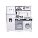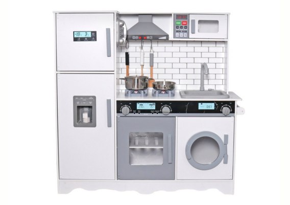 Kuchnia posiada wiele pokręteł i drzwiczek, co sprawi, że kilkulatek rozwinie swe umiejętności motoryczne i odruch chwytania przedmiotów o różnym kształcie. Cała kuchnia ma kolor biały z szarymi i czarnymi elementami.