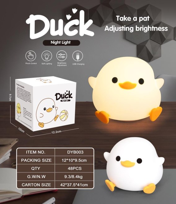 Lampka nocna, kaczuszka dla dzieci od trzeciego roku życia. Lampka wykonana została z silikonu wolnego od BPA, miękkiego i wygodnego. Daje ciepłe i delikatne światło, tworzy przytulne i bezpieczne otoczenie. Oferuje trzy poziomy regulacji jasności (10%, 50%, 100%). Lampka posiada wbudowany akumulator typu 3,7V, ładowany za pomocą kabla USB typu C. Dzięki dotykowemu sensorowi lampkę możesz włączać lub wyłączać, a także regulować moc światła dotykając ją w dowolne miejsce.