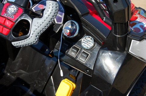 wejście MP3, wgrane piosenki w pamięć, 3 prędkości jazdy z pilota, duże pompowane koła, uruchamiany za pomocą kluczyka, amortyzatory na 4 kołach