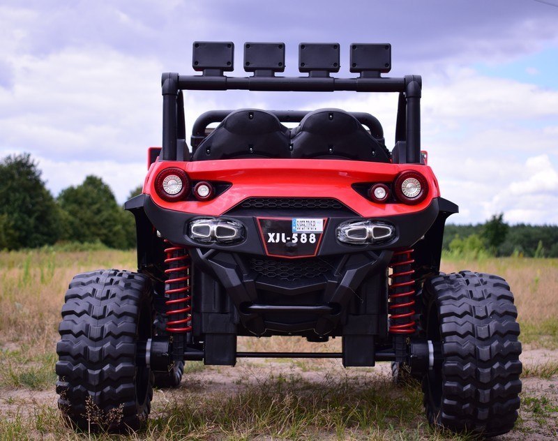 Ciekawym elementem jest oświetlenie pojazdu - świecące światła przednie i tylne. Dodatkową atrakcję stanowi funkcja bujania i klimatyzacja :) Duże koła EVA wraz z amortyzatorami zapewniają cichą i wygodną jazdę. Podświetlana deska rozdzielcza pojazdu wraz ze panelem slotem na kartę micro SD, podłączenie USB czy MP3 - daje pełen komfort użytkowania.