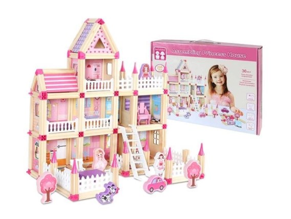 Zestaw drewnianych, kolorowych i bezpiecznych klocków dla dzieci od 3-go roku życia. Pakiet składa się z 298 elementów, które po ułożeniu tworzą drewniane domki dla księżniczek. Prócz elementów konstrukcyjnych w zestawie znaleźć możemy również klocki w kształcie drzewa, z postaciami księżniczek, czy autami, jest też obrazkowa instrukcja.