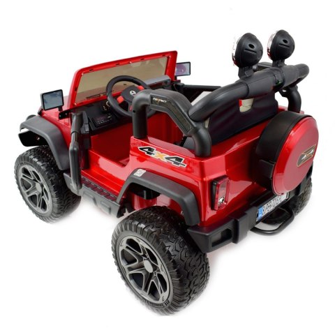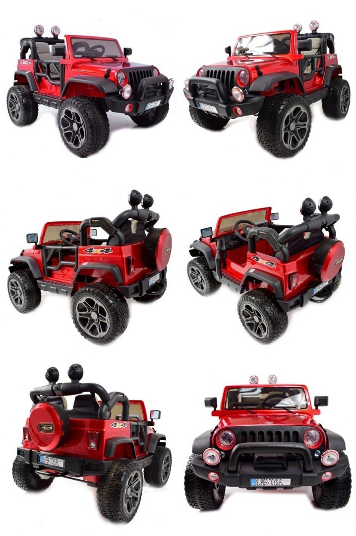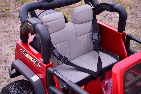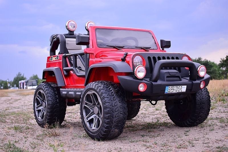 miękkie koła, SYSTEM WOLNEGO STARTU i SYSTEM HAMOWANIA, otwierana maska, otwierane koło zapasowe, pasy dla dwójki dzieci, amortyzatory tył, uchwyt do holowania, miękkie siedzenie