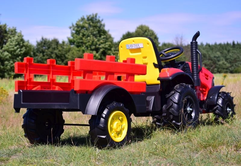Traktor T990 na pompowanych kołach AIR z przyczepą napędzany dwoma mocnymi silnikami 45 W z całą pewności zainteresuje młodego wielbiciela traktorów.