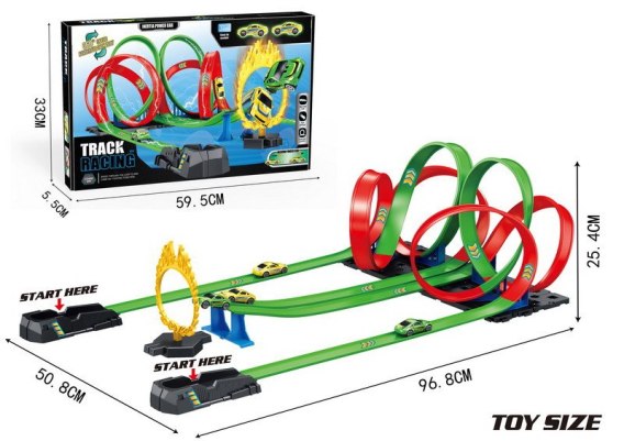 Podwójny tor wyścigowy z wyrzutnią i pętlami dla dzieci od 3-go roku życia. Tor wykonano z najlepszej jakości plastiku w żywych kolorach. Zestaw składa się z dwóch, połączonych ze sobą torów, posiadających odcinki proste do rozpędzenia pojazdu, pętle 360 stopni, wspólną wyrzutnię i dwa pojazdy. Idealna zabawa dla dwóch osób. Pojazdy napędzane są napędem pull back. Wystarczy delikatnie nacisnąć pojazd do tyłu, by przejechał tor z pełną mocą.