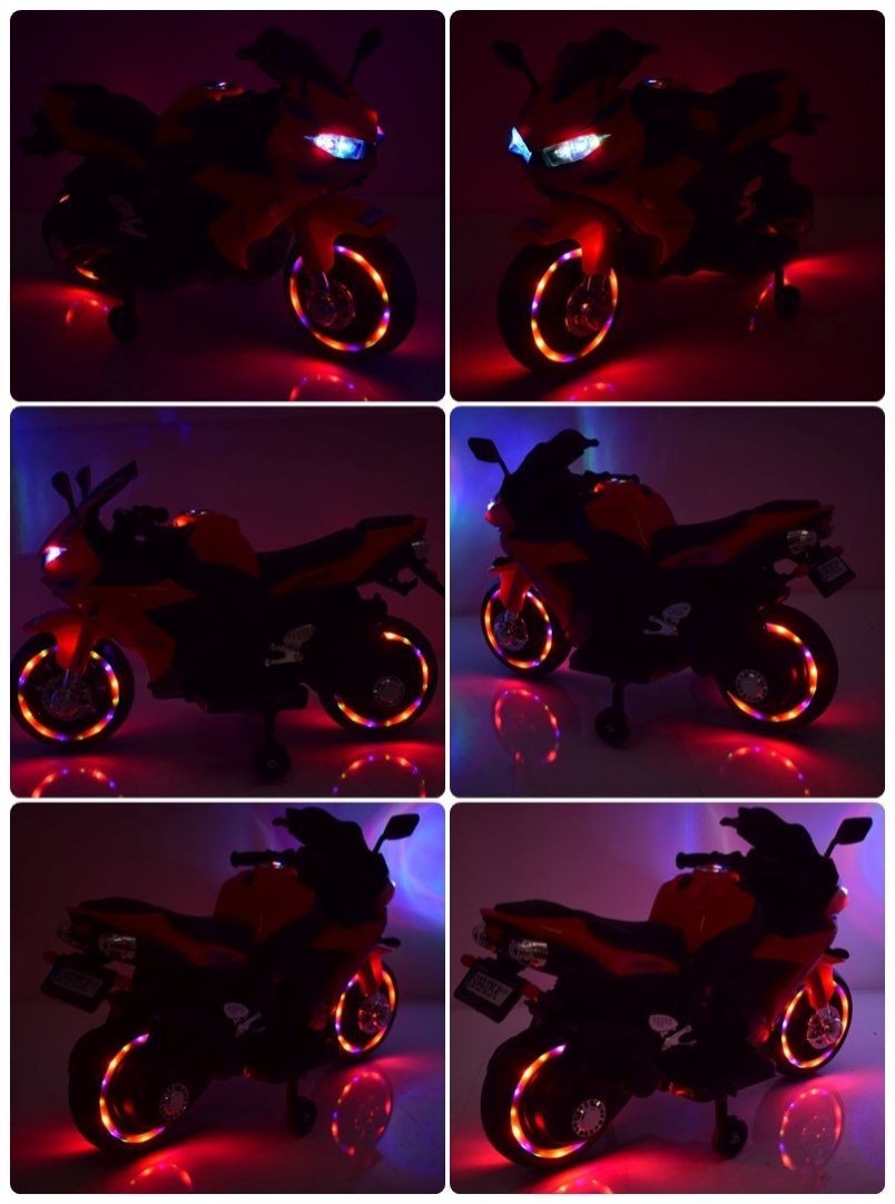 Panel z dźwiękami ( dźwięki odpalania motocykla) z wejściem USB i AUX i oświetlenie pojazdu ( światła oraz świecące koła) umili o urazmaici zabawą.