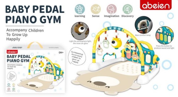 Interaktywna, wielofunkcyjna mata dla najmłodszych od pierwszych dni życia. Zestaw zbudowany jest z wygodnej maty dla maluszka, pałąka z zawieszkami i pianinka. Mata rośnie wraz z dzieckiem. W pierwszym okresie życia, do szóstego miesiąca życia, maluszek może leżeć na wygodnej macie, kopiąc nóżkami w pianinko, oraz przebierać rączkami próbując dosięgnąć zawieszek na pałąku. Między szóstym a dwunastym miesiącem, zestaw będzie niezwykle pomocny przy nauce siadania. Starsze dziecko może grać już samodzielnie na pianinku. Pianinko, można w bardzo łatwy sposób przekształcić w stolik muzyczny za pomocą przycisków do regulacji, znajdujących się po boku pałąka. Możemy pochylać pianinko w kilku pozycjach, lub je odłączyć od zestawu i zabrać w różne miejsca. Dodatkowo pianinko posiada wygodną rączkę do przenoszenia. Pianinko wyposażono w cztery klawisze, każdy z inną melodią oraz 2 przyciski zmieniające funkcje pianinka z melodii na nuty. Jest też włącznik i wyłącznik oraz regulacja głośności. Na pałąku znajduje się 5 zawieszek z misiami, które również delikatnie grzechoczą. Środkowy miś dodatkowo posiada oświetlenie oraz funkcje dźwiękowe. Po bokach podstawy znajdują się przekładanki z koralikami. Pianinko zasilane jest bateriami typu 3 x AA 1,5 V (brak w zestawie), misiu-zawieszka bateriami typu 2 x AAA 1,5 V.