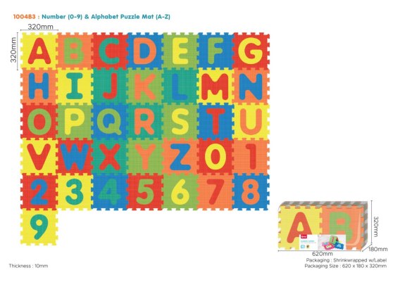 Zestaw składa się z 36 puzzli z których można ułożyć matę na podłogę chroniącą przed zimnem oraz amortyzującą upadki lub zbudować figury przestrzenne np. kostkę. Puzzle posiadają wyjmowane literki i cyfry, dzięki czemu maluszek uczy się dopasowywać kształty.